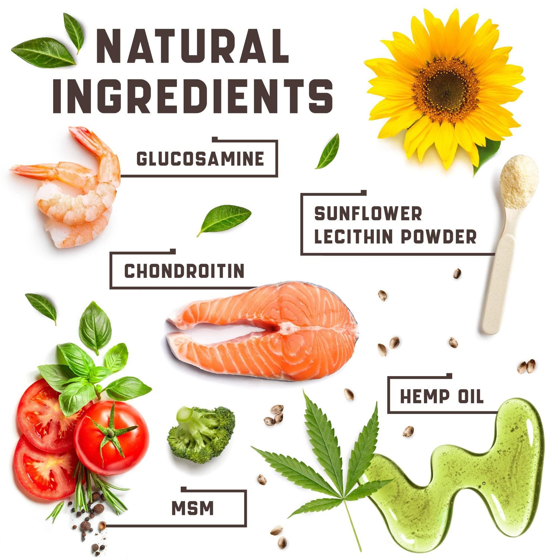 Glucosamine, MSM, and Chondroitin, plus hemp seed and natural botanicals. No wheat, corn, soy, or GMOs.